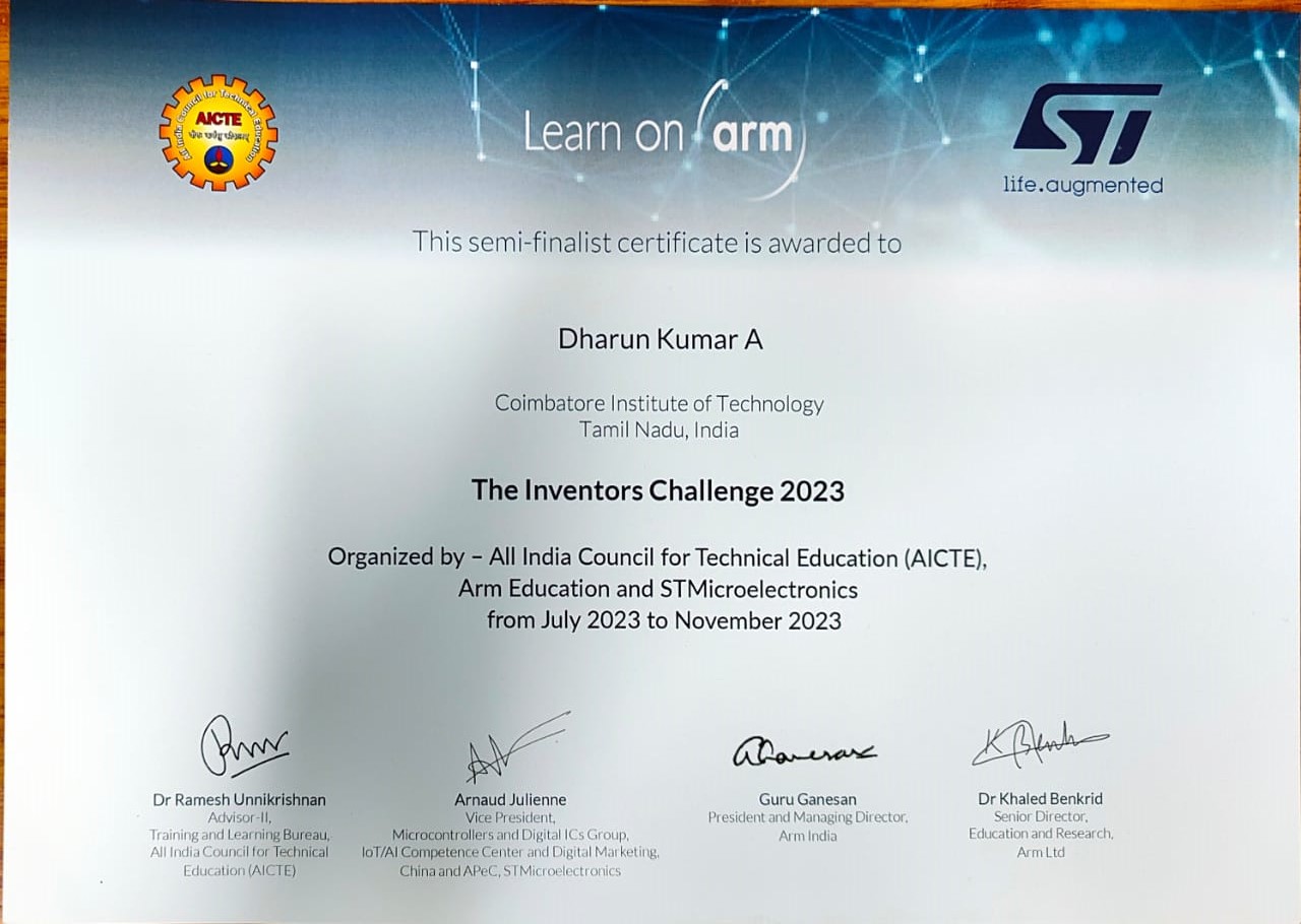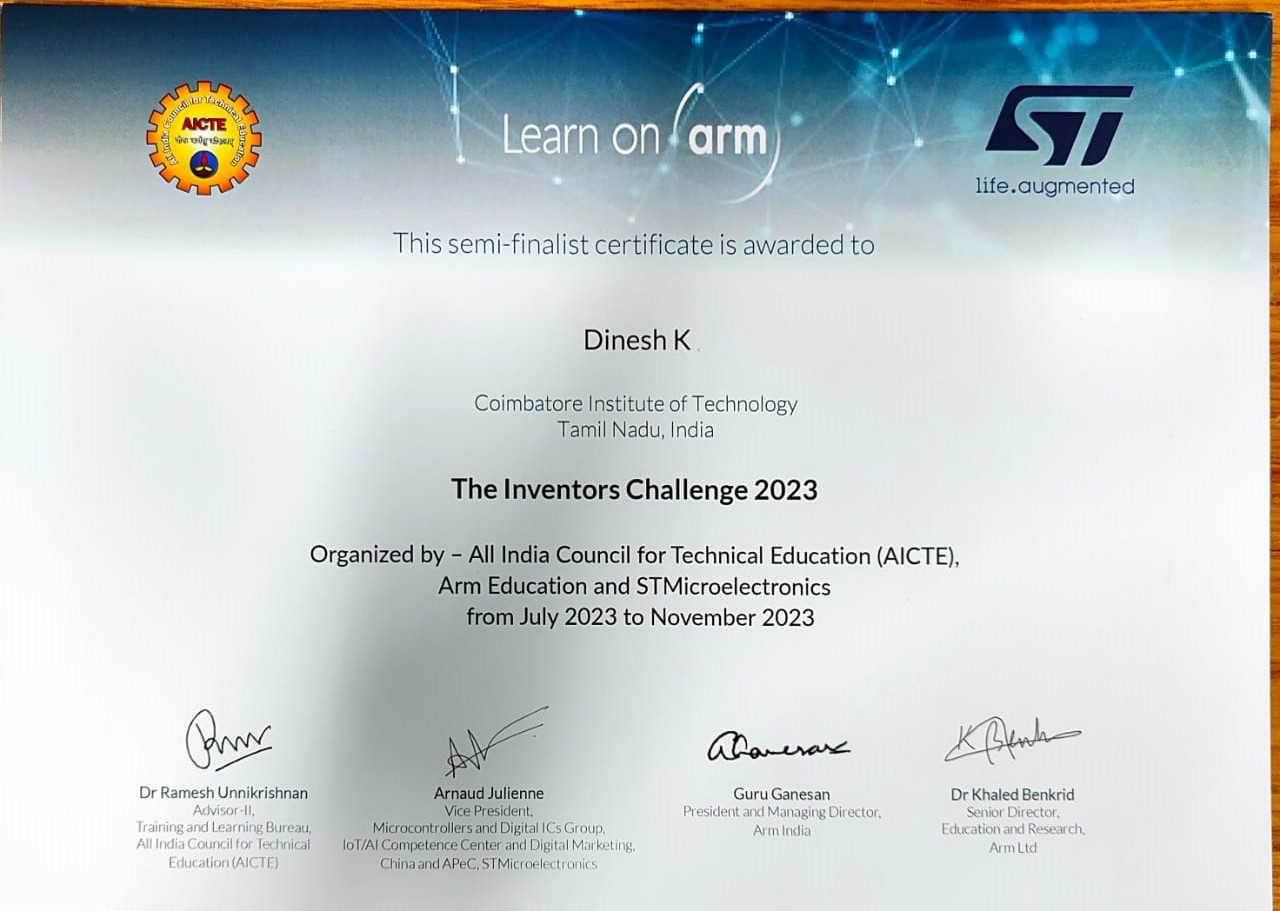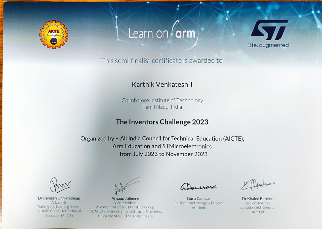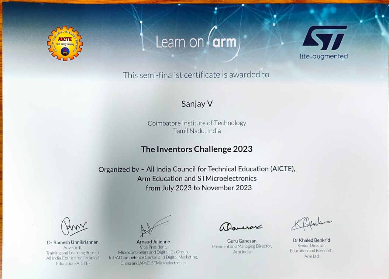 This innovative project was recognized as a Semi-Finalist in the prestigious AICTE Inventors Challenge 2023, organized by ARM India and