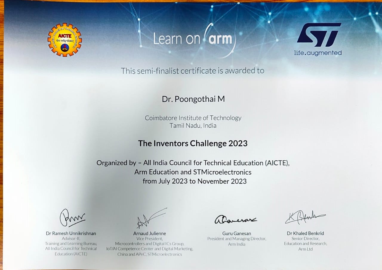 Guided by Dr. M. Poongothai, Professor, ECE, CIT, the team explored cutting-edge technologies, gaining hands-on experience in: